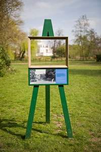 Ten signs have been installed in the recently-restored gardens, each showing a historical view of Chiswick. Empty golden picture frames above each sign capture how the same view looks today.