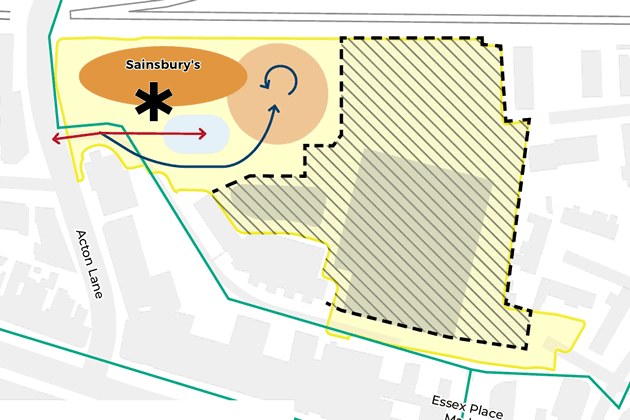 The current partnership between Sainsbury’s and St James is the most advanced proposal yet. The site is formally designated as Site Allocation 107 in Hounslow’s emerging Local Plan, requiring a new supermarket of at least 5,300 sqm, a minimum of 300 housing units, improved public spaces and pedestrian routes and reduced surface parking.