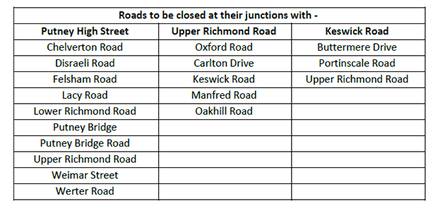 Roads to be closed at their junctions with -