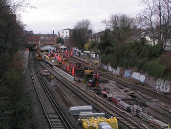 Taken from a slightly different angle, the track has been completely removed from platform two, in readiness to be skewed further away from platform one, prior to that platform being rebuilt a few days later. Platforms two and three are in the process of being lengthened in the direction of Waterloo. |