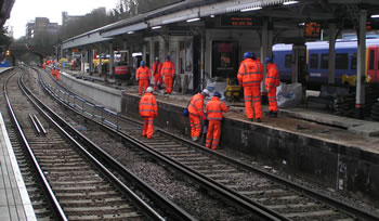 For many weeks now, contractors working for Network Rail have been busy lengthening the platforms at stations between Waterloo and Windsor. The contract was due to be concluded by 31 December 2011. Strangely, virtually nothing seemed to be happening at Putney itself. But everything changed when train services ceased on Christmas Eve. A small army then moved in to make the station ready for trains of ten coaches, rather than the current maximum of eight coaches. Working 24 hours a day, it looked as if the job would be completed in time for normal services to resume on the morning of 3 January. With no services on Christmas Day nor Boxing Day, initially work was focused on the island platform in the middle of the station: platforms two and three. This is the view from the Oxford Road bridge at lunchtime on Boxing Day. A permanent way train can be seen parked under the bridge at the end of platform four. |
